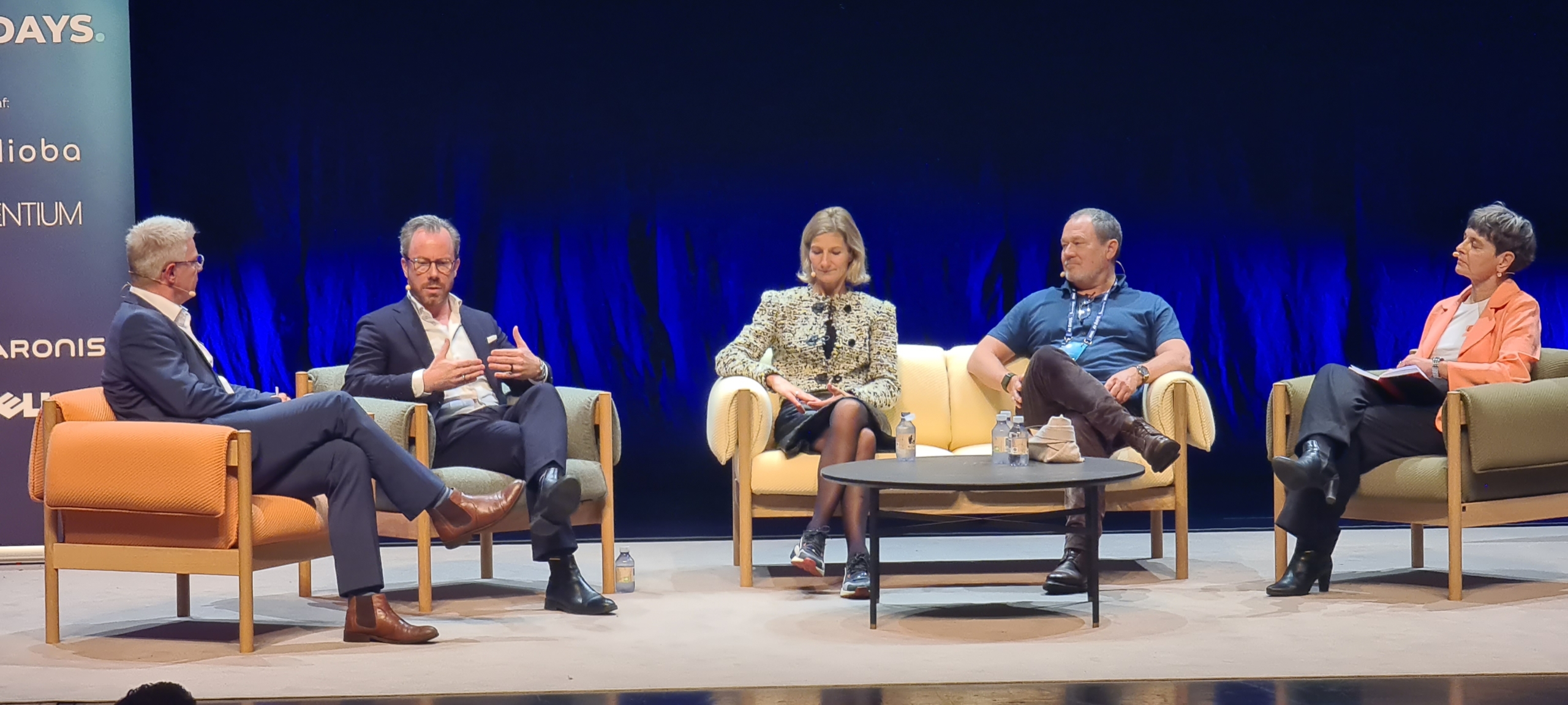 Jan Erik Elgaard som moderator til paneldebat med Jacob Ellemann Jensen, Dansk Erhverv, – Mette Louise Kaagaard, Microsoft, – Jeppe Hedaa, Kristendemokraterne, – Sara Vergo, DJØF ved AI Days i Musikhuset i Århus
