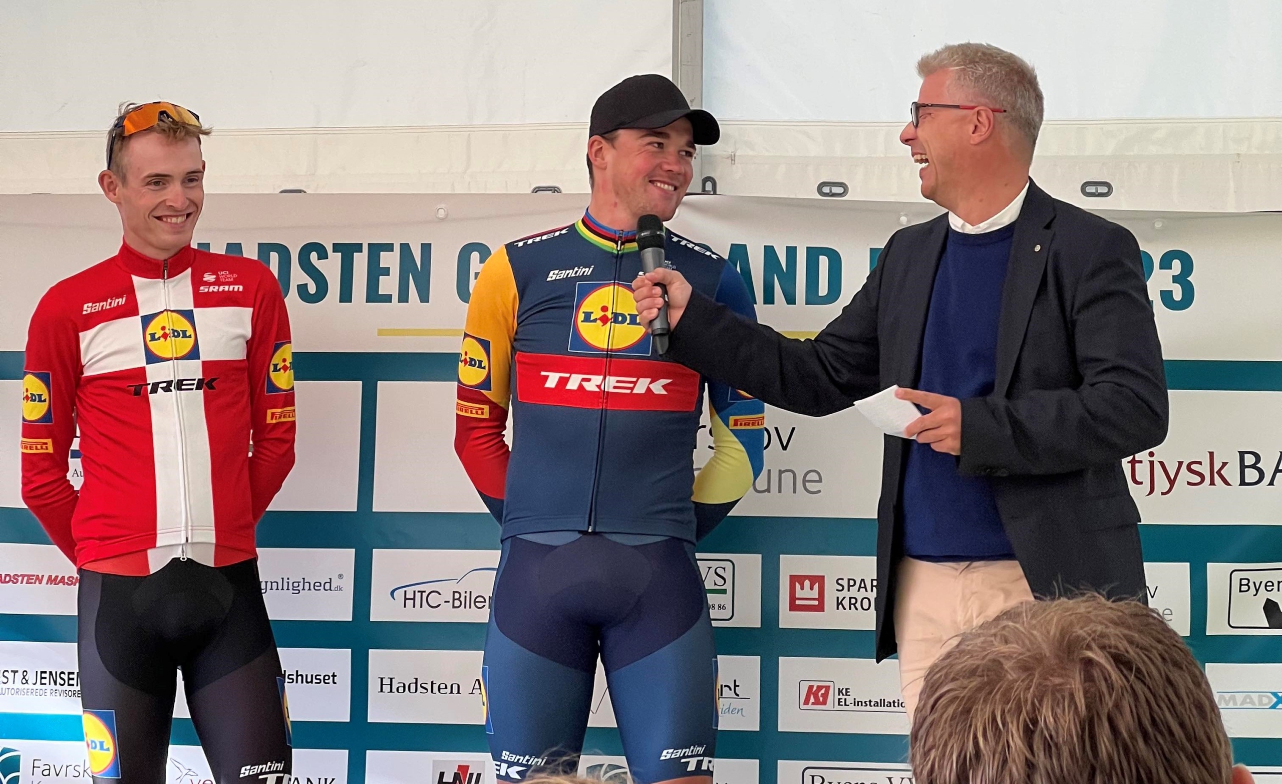Jan Erik Elgaard interviewer Mads P og Skjelmose til Hadsten Gadegrandprix